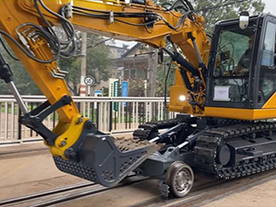安裝鐵路導向輪,履帶板采用橡膠板,能實現在鐵路線路上自由上下道,并確保在鋼軌上行走而不會損傷鋼軌。